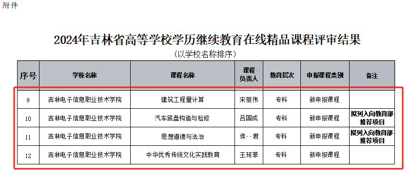 4月24日,吉林省教育厅公示了2024年吉林省高等学校学历继续教育在线精品课程评审结果,我校申报的《建筑工程量计算》《汽车底盘构造与检修》《思想道德与法治》《中华优秀传统文化实践教育》四门课程成功入选,其中《汽车底盘构造与检修》《思想道德与法治》两门课程拟列入向教育部推荐项目。 (供稿单位:教务处 初审:孟令飞 复审:刘莹 终审:汤海涛)